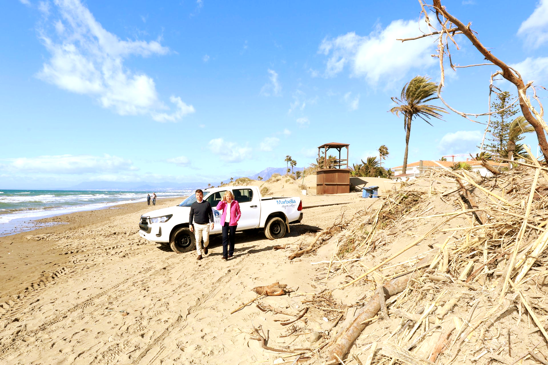 Marbella. — Después de semanas de lluvias persistentes, fuertes vientos y un oleaje inusual, la ciudad ha puesto en marcha un plan para reparar un litoral castigado. El Ayuntamiento destinará 410.000 euros a la recuperación de sus playas, con el objetivo de llegar en condiciones aceptables al inicio de la temporada alta. La alcaldesa, Ángeles Muñoz, describió la situación como “uno de los inviernos más duros de los últimos años”, no solo por la intensidad de las precipitaciones, sino por la combinación de temporales marítimos que han acelerado la erosión en prácticamente toda la franja costera del municipio. Según explicó, los daños se extienden desde los sistemas dunares hasta los paseos marítimos y accesos, con una acumulación significativa de restos vegetales arrastrados por el mar. El plan de choque moviliza a todos los servicios municipales disponibles y, la maquinaria pesada trabaja ya en el reperfilado de la línea de costa, la retirada de cañas y residuos y la recuperación de la anchura de las playas, apoyada por equipos específicos para el cribado de arena. La intervención incluye además la reposición de pasarelas y mobiliario, la sustitución de equipamientos dañados y el transporte de arena desde zonas con excedente. Entre los enclaves que han sufrido un impacto está la playa de Artola-Cabopino donde se han perdido hasta cinco metros de franja litoral y más de un metro de cota en determinados puntos, afectando incluso al cordón dunar protegido. La Víbora presenta deterioros tanto en el sistema dunar como en equipamientos, mientras que en Real de Zaragoza y Alicate se han detectado descalces que superan el metro y daños en pasarelas de madera.
